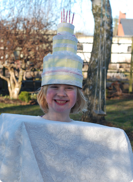 Anna, hun ville allerede sidste år være lagkage. Jeg har haft laaaang tid til at tænke. Og jeg har skam forsøgt at sy en lagkage til hovedet. Det var bare for bøvlet, for "jeg-vil-bare-vise-alt-det-jeg-overkommer-at-sy"-agtigt, så jeg greb den noget nemmere papkasse-strategi...